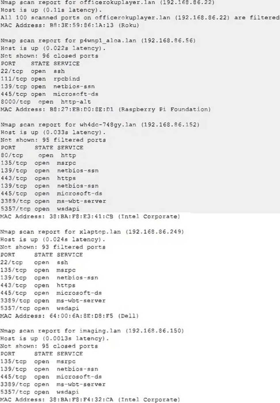 Due to reports of unauthorized activity that was occurring on the internal network, an analyst is performing a network discovery. The analyst runs an Nmap scan against a corporate network to evaluate which devices were operating in the environment.