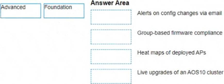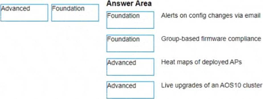 A network administrator with existing IAP-315 access points is interested in Aruba Central and needs to know which license is required for specific features Please match the required license per feature (Matches may be used more than once.)