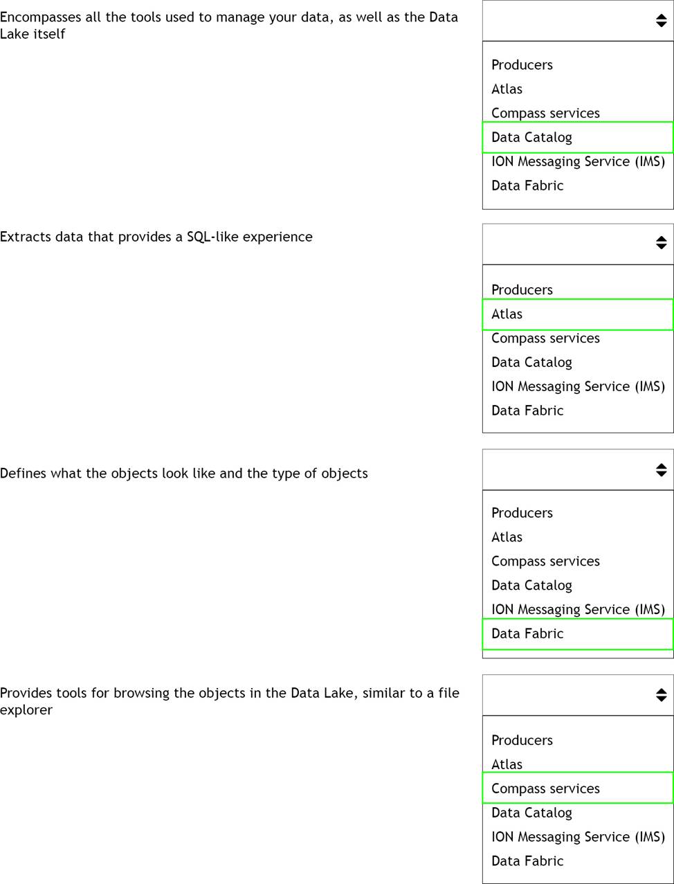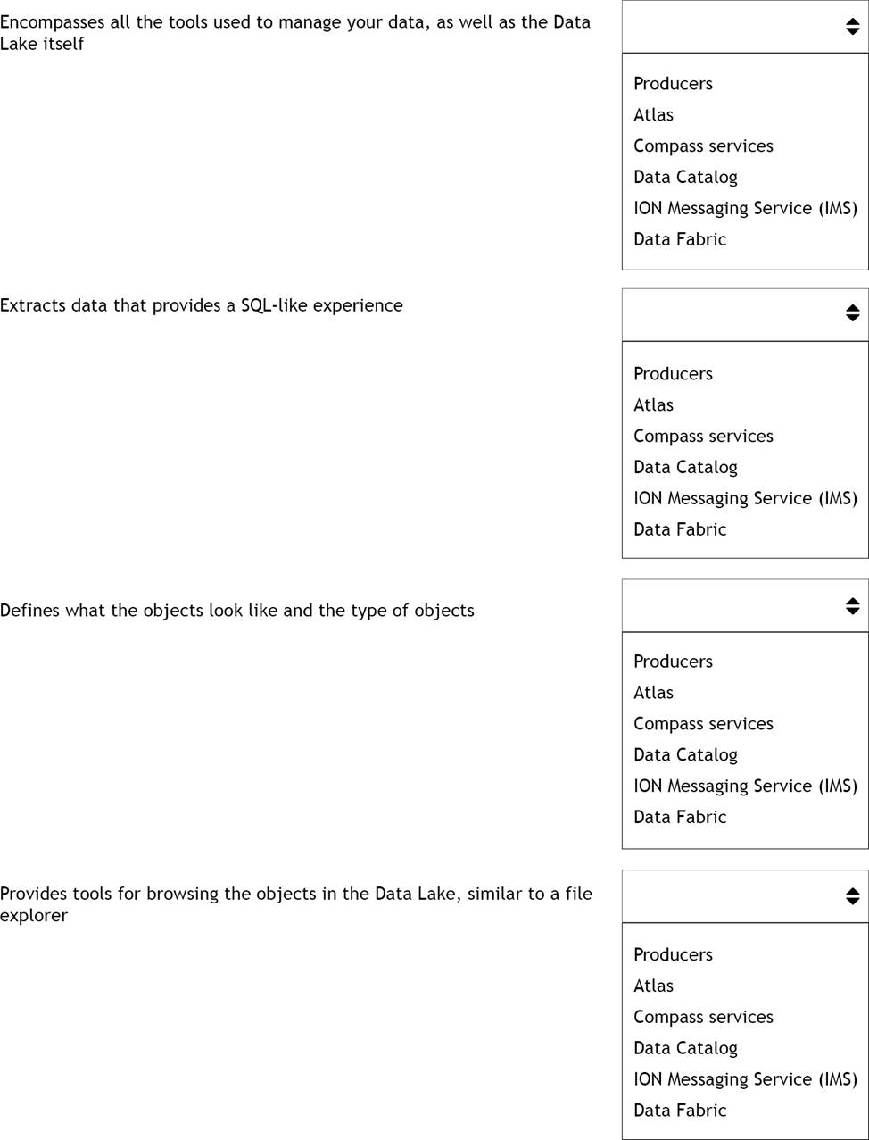 Select from the drop-down lists on the right, the Data Lake service that corresponds with each description on the left. Use an option only once, however, not all options will be used.