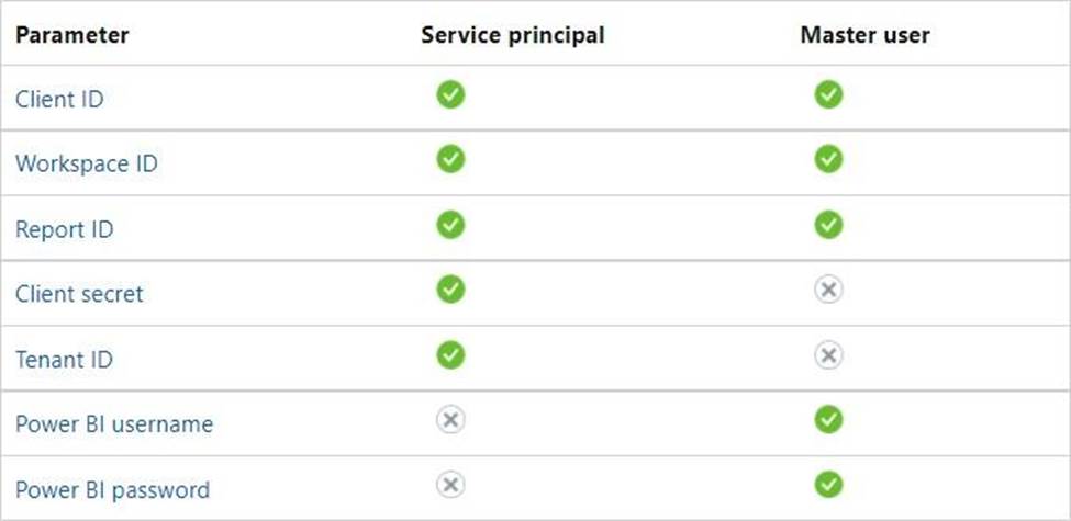 To embed your content, you need to obtain certain parameter values. The table below shows the required values, and indicates if they're applicable to the service principal authentication method, the master user authentication method, or both.