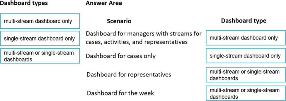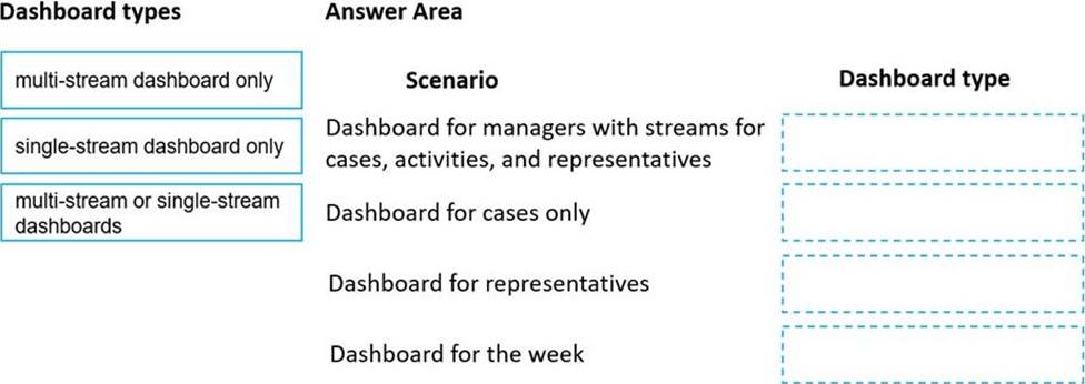 Which dashboard types should you use? To answer, drag the appropriate dashboard types to the correct scenario. Each dashboard type may be used once, more than once, or not at all. You may need to drag the split bar between panes or scroll to view content. NOTE: Each correct selection is worth one point.