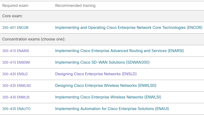 To earn CCNP Enterprise, you pass two exams: a core exam 350-401 Implementing and Operating Cisco Enterprise Network Core Technologies (ENCOR) and an enterprise concentration exam of your choice. And every exam in the CCNP Enterprise program earns an individual Specialist certification, so you get recognized for your accomplishments along the way.