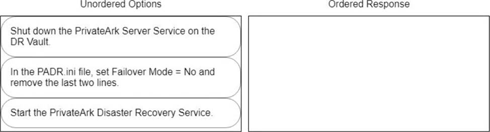 ADR Vault became active due to a failure of the primary Vault. Service on the primary Vault has now been restored. Arrange the steps to return the DR vault to its normal standby mode in the correct sequence.