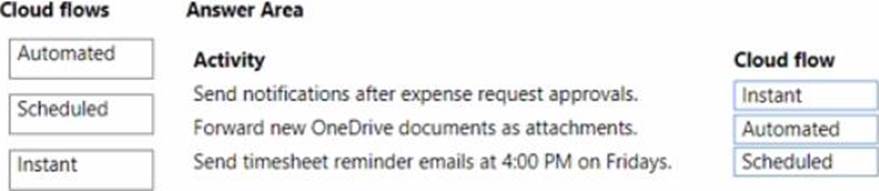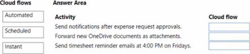 Which cloud flow types should you create? To answer, drag the appropriate cloud flows to the correct activities. Each cloud flow may be used once, more than once, or not at all. You may need to drag the split bar between panes or scroll to view content. NOTE: Each correct selection is worth one point.