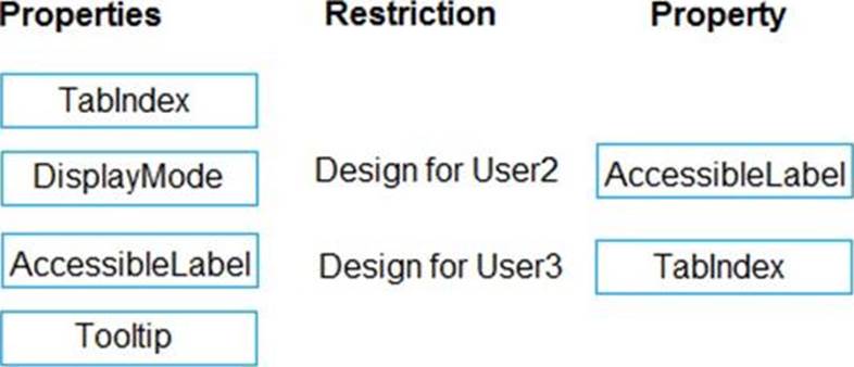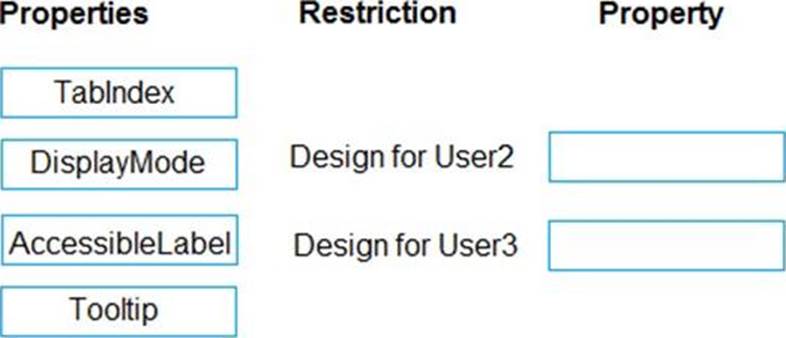 Scenario: Before deploying the app to production, you must ensure that the app conforms to Microsoft accessibility and performance guidelines. User2 is visually impaired and cannot see images.