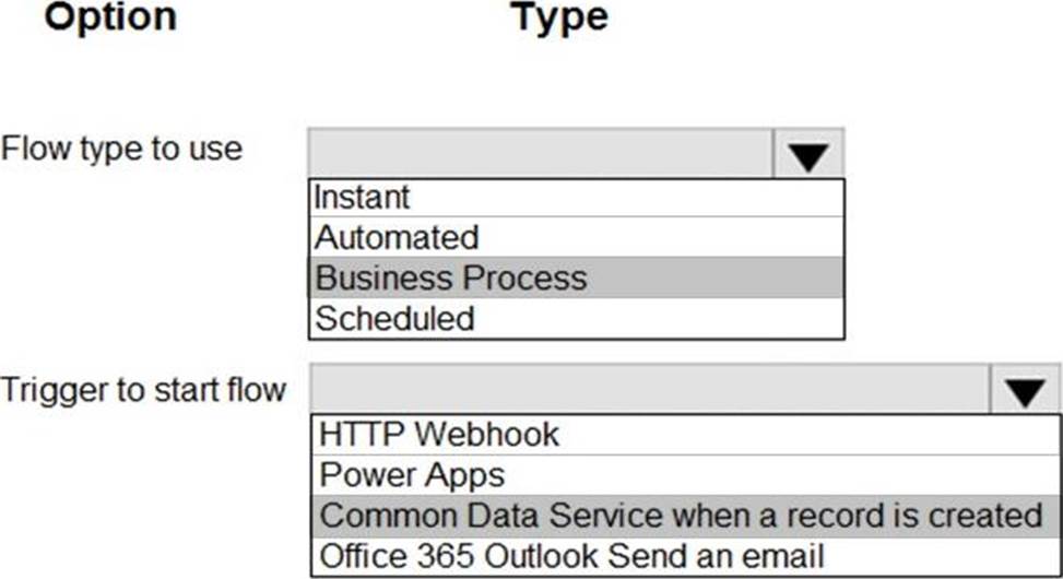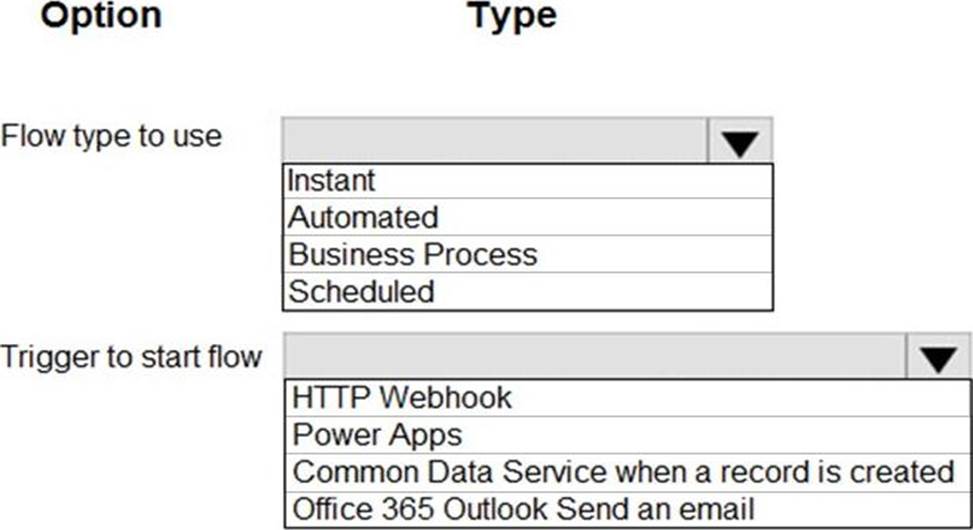 How should you create the flow? To answer, select the appropriate options in the answer area. NOTE: Each correct selection is worth one point.