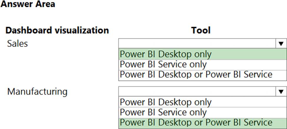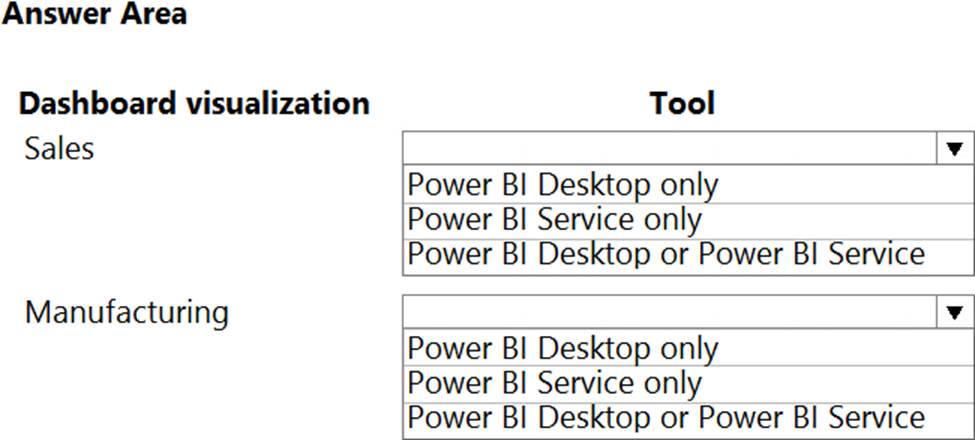 What should you use to create the visualizations? To answer, select the appropriate options in the answer area. NOTE: Each correct selection is worth one point.