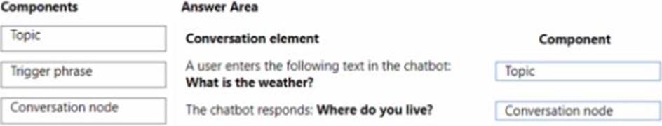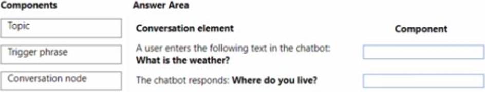 Which chatbot component should you use? To answer, drag the appropriate components to the correct conversation elements. Each component may be used once, more than once, or not at all. You may need to drag the spirt bar between panes or scroll to view content. NOTE: Each correct selection is worth one point.