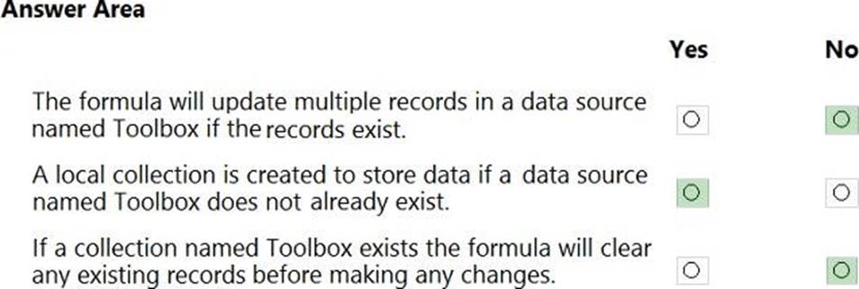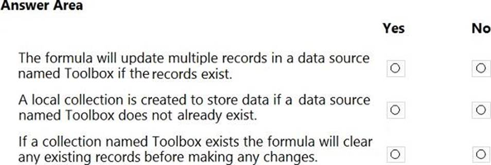 Which Power Fx formulas should you use? To answer, select the appropriate options in the answer area. NOTE: Each correct selection is worth one point.