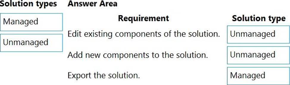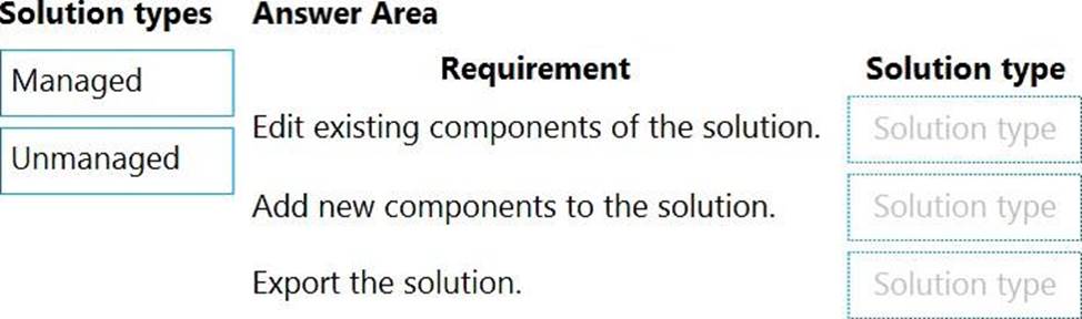 Which types of solutions should you create? To answer, drag the appropriate solution types to the correct requirements. Each solution type may be used once, more than once, or not at all. You may need to drag the split bar between panes or scroll to view content. NOTE: Each correct selection is worth one point.
