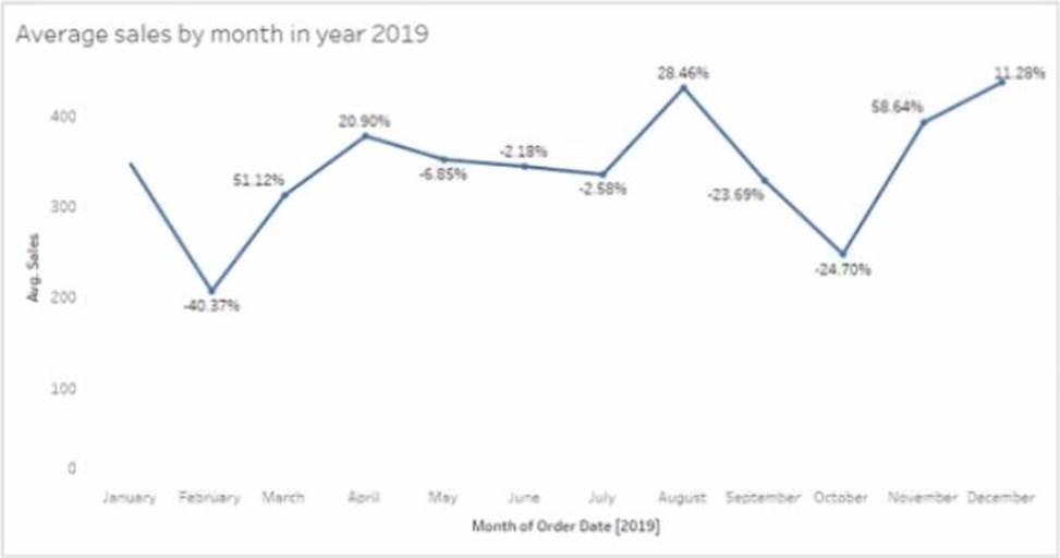To find the month that had the biggest increase in average sales compared to the previous month in 2019, you need to compare the slopes of the line segments between each pair of months. The steeper the slope, the greater the increase. Based on the line chart, October had the steepest slope, meaning it had the biggest increase in average sales compared to September in 2019.